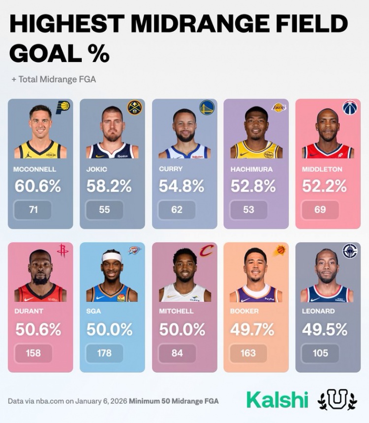 1、麦康纳 60.6%(出手71次)2、约基奇 58.2%(55)3、库里 54.8% (62)4、八村塁 52.8% (53)5、米德尔顿 52.2%(69)6、杜兰特 50.6%(158)7、亚历山大 50%(178)8、米切尔 50%(84)9、布克 49.7% (163)10、小卡 49.5%(105)注:至少出手50次...